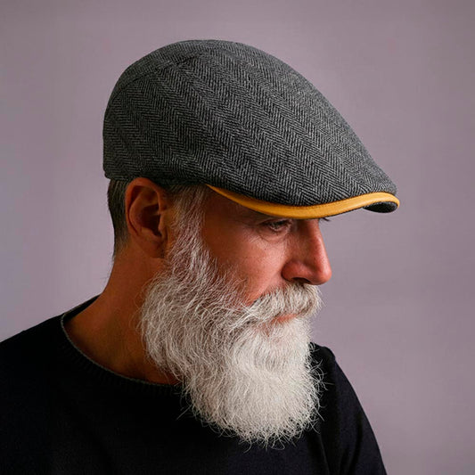 Turn heads with our updated take on the classic newsboy-style cap. With its black-and-white herringbone pattern and standout brim in mustard yellow everyone will ask you "where di you get that cap?".